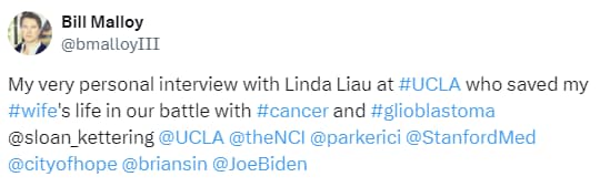 You don’t have to give it much thought, what drove Philanthropist and Venture Capitalist Bill Malloy to interview Dr. Linda Liau. His wife, Shenell Malloy was treated by Liau at UCLA and her oncology care was managed by Dr. Timothy Cloughesy. After being diagnosed in early 2019, she underwent a craniotomy to remove the tumor, followed by an intense regimen of chemotherapy and radiation.