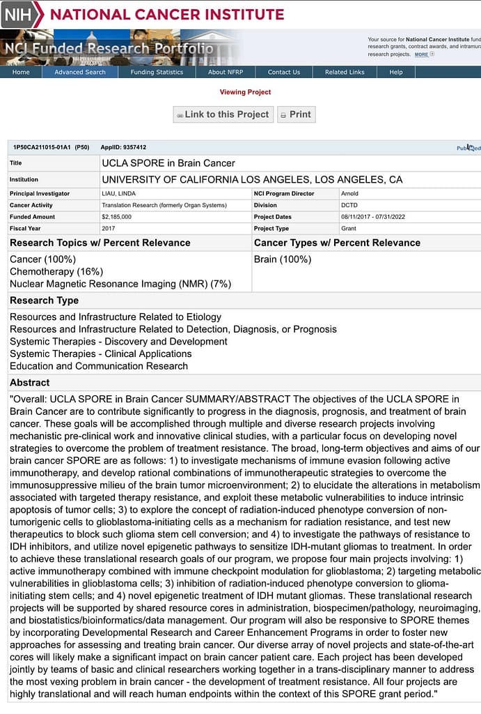 Look at the grant number in the image for this article. It is for the UCLA Spore (brain cancer, SPORE 1 project being DCVax-L and Keytruda) 1P50 CA211015. Follow the grant to the Grantome website.