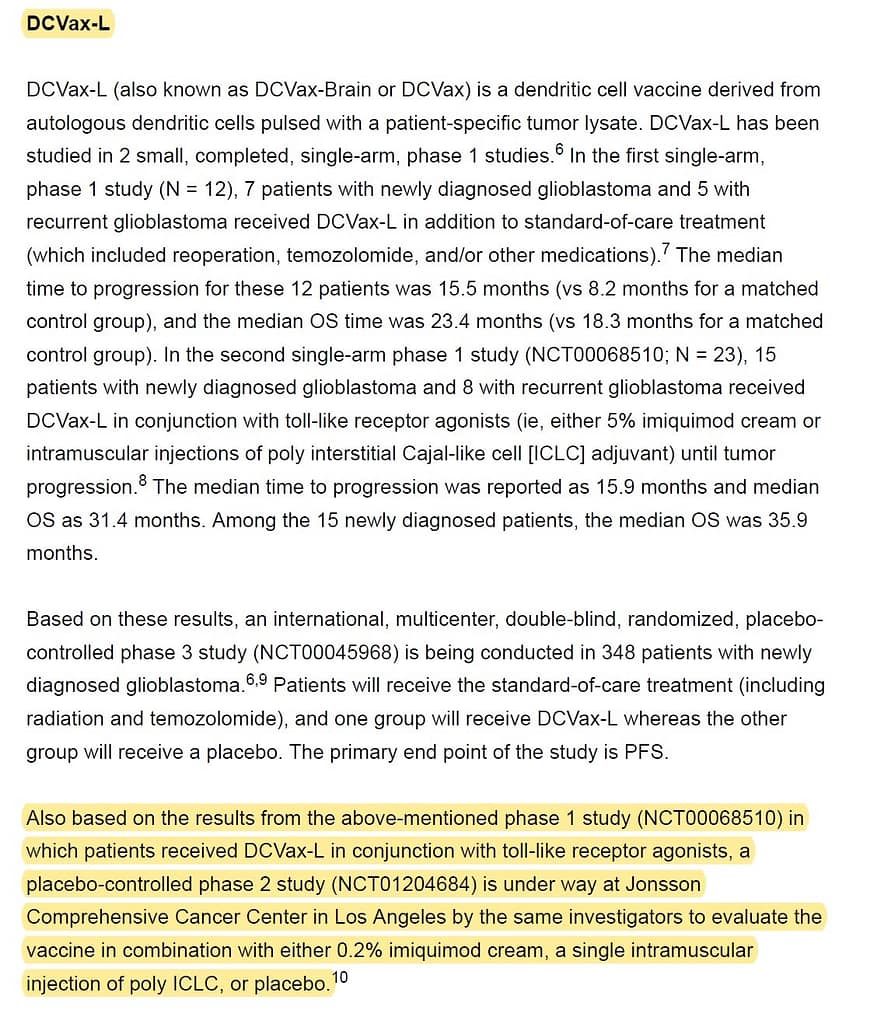 “Also based on the results from the above-mentioned phase 1 study (NCT00068510) in which patients received DCVax-L in conjunction with toll-like receptor agonists, a placebo-controlled phase 2 study (NCT01204684) is under way at Jonsson Comprehensive Cancer Center in Los Angeles by the same investigators to evaluate the vaccine in combination with either 0.2% imiquimod cream, a single intramuscular injection of poly ICLC, or placebo.“